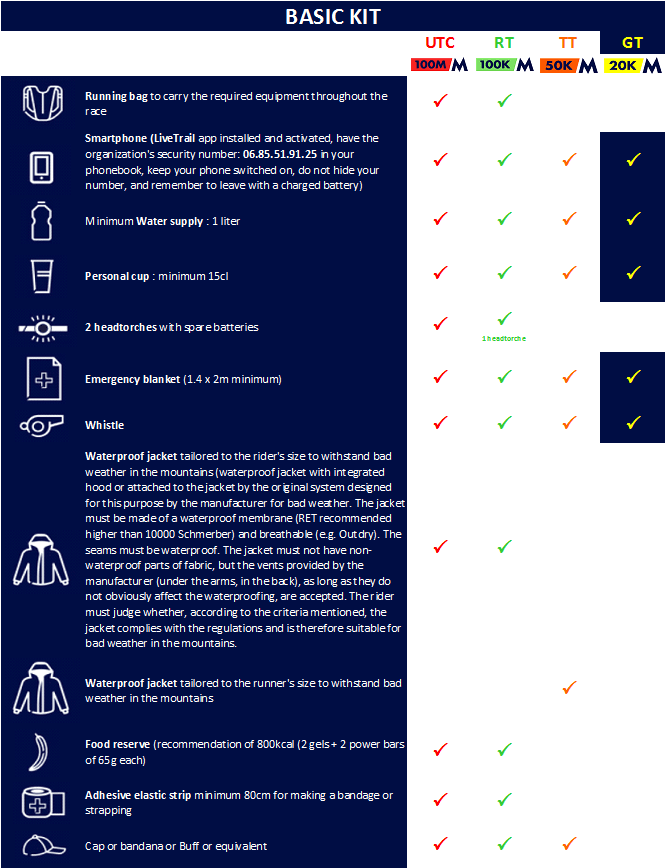 You must have the required equipment with you at all times, or you will be penalized. Checks may be carried out during races, just before the start and up until the finish. It is important to note that the equipment required by the organizer is a vital minimum that each trail runner must adapt according to their own abilities. We strongly advise you to test it during training outings in varied conditions and to bring everything you will need.